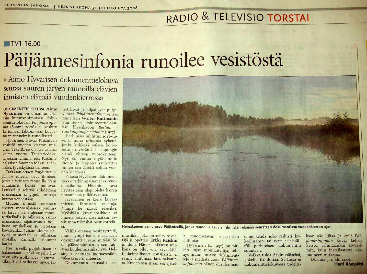 2008 dokumenttielokuva Päijännesinfonia (ensi-ilta 25.4.2008), 56 min. tuotanto Amigos Media (www.amigosmedia.fi). Esityksiä TV1 2009-10, lisäksi erillisiä esityksiä (Suomi, Viro, Tsekki, USA) 2009-2012. Aamulehden arvio ja Hesarin arvio.